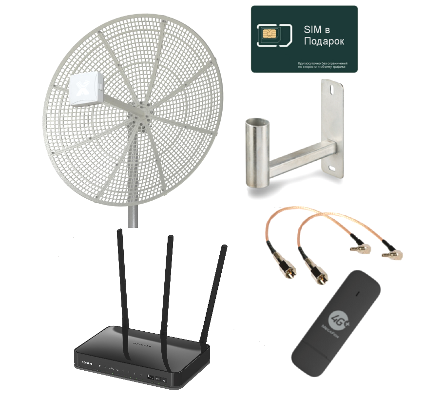 В состав комплекта входит антенна VIKA-24F MIMO, которая предназначена для усиления сигнала Интернета мобильных операторов связи и используется в комплекте с универсальными широкополосными 3G/4G модемами стандарта LTE 2600, UMTS 2100, WCDMA, HSDPA, HSUPA и др. диапазона 1,7-2,7 ГГц. Антенна рекомендуется к применению на значительном расстоянии от базовой станции. Благодаря поддержке антенной технологии MIMO 2×2, скорость передачи данных может достигать до 150 Мбит/с. Модем Huawei-E3372 используется для подключения к беспроводным сетям 3G HSPA и 4G/ LTE. . В комплект также входит маршрутизатор Wi-Fi, с поддержкой модемов 4G, разъемы для подключения антенны к модему и кронштейн. Комплект поддерживает SIM-карты всех операторов мобильной связи.